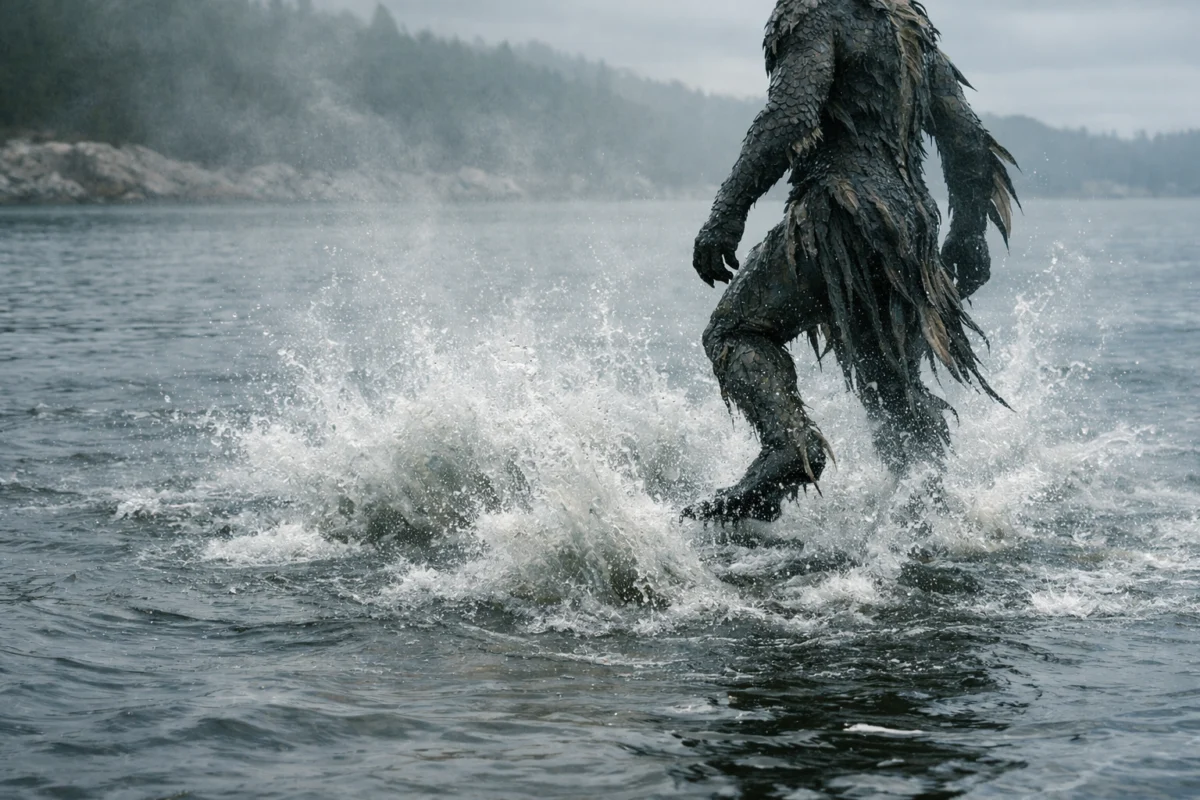 The folklore version reads like folk horror: gaunt humanoid shape, slick skin, long grabbing fingers, and a habit of hiding in weed and murk.